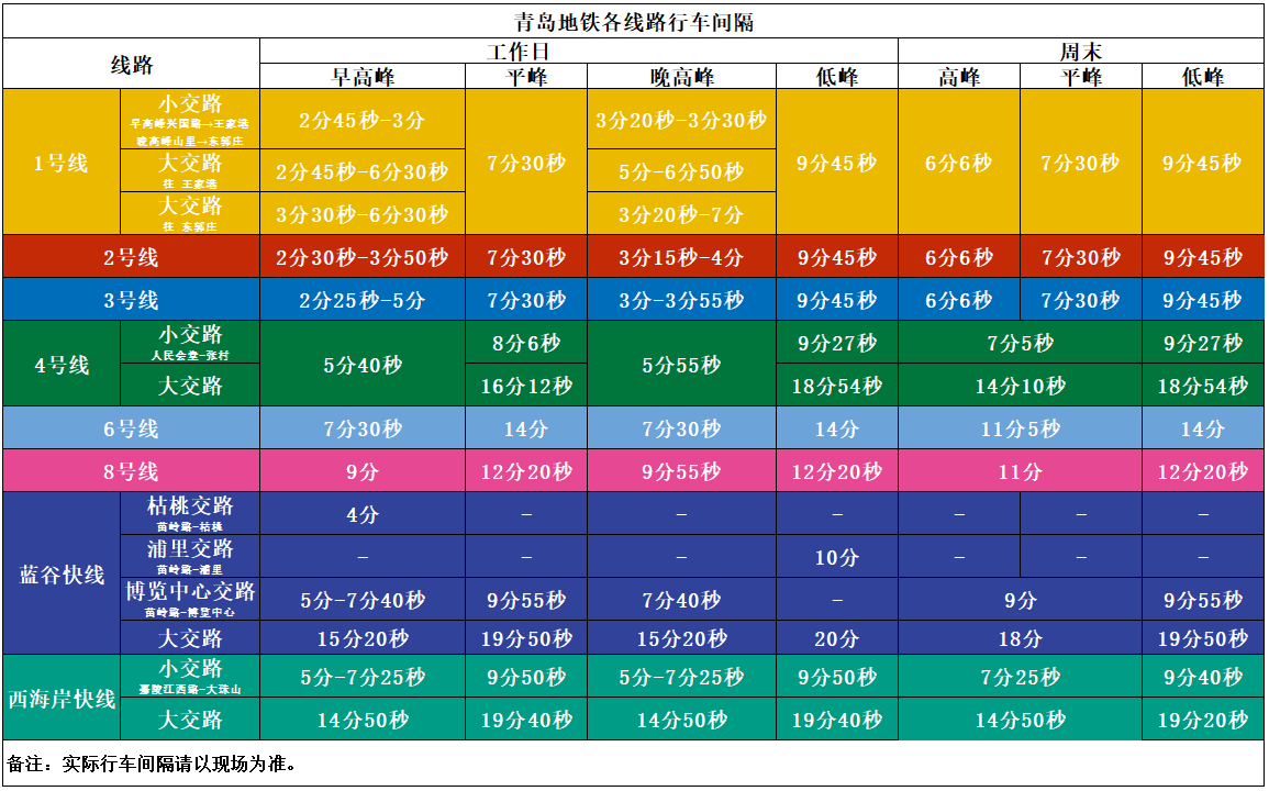 同时,为匹配市民出行需求,青岛地铁优化运力配置,各线路工作日、周末行车间隔均调整。其中工作日20:20之后,原蓝谷快线部分由苗岭路站始发、终到博览中心站的小交路列车,终点站将调整为浦里站,请您乘车前留意列车终到信息,避免耽误行程。您可通过青岛地铁APP获取列车计划到站信息宏源证券,提前规划行程。
