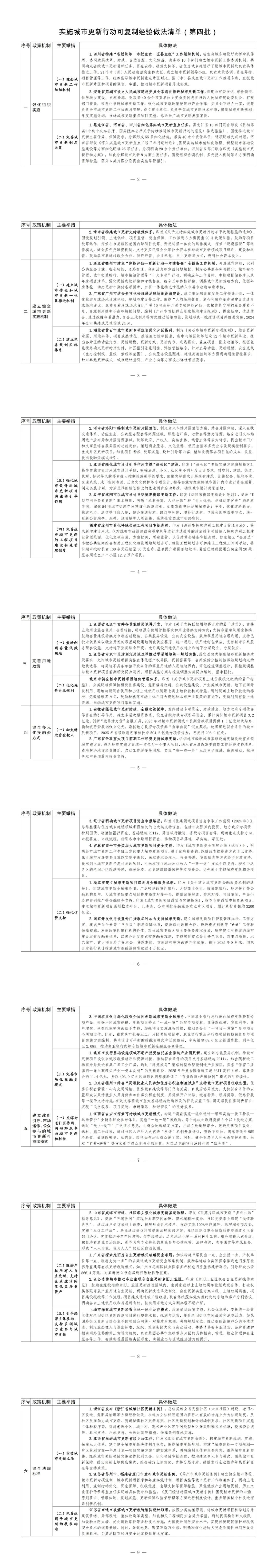为深入贯彻中央城市工作会议精神,落实《中共中央办公厅、国务院办公厅关于持续推进城市更新行动的意见》,住房城乡建设部总结各地在强化组织实施,建立健全城市更新实施机制,完善用地政策,健全多元化投融资方式,建立政府引导、市场运作、公众参与的城市更新可持续模式,健全法规标准等方面经验做法,形成《实施城市更新行动可复制经验做法清单(第四批)》。