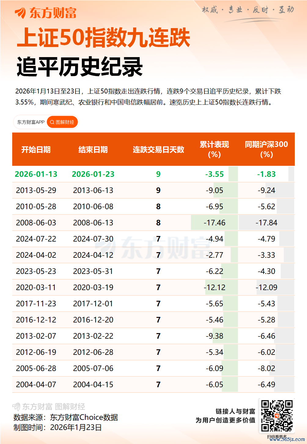 复盘历史数据,上证50指数仅出现过两次9连跌,第一次发生于2013年5月29日至当年6月13日,区间累计跌幅超过9%;时隔12年,2026年1月13日至23日的本轮调整,成为该指数历史上第二次9连跌,区间跌幅达3.55%。